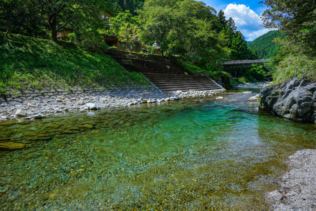 清流と山並みの風景が美しく、夕景も映えます。自然派フォトにぴったり。