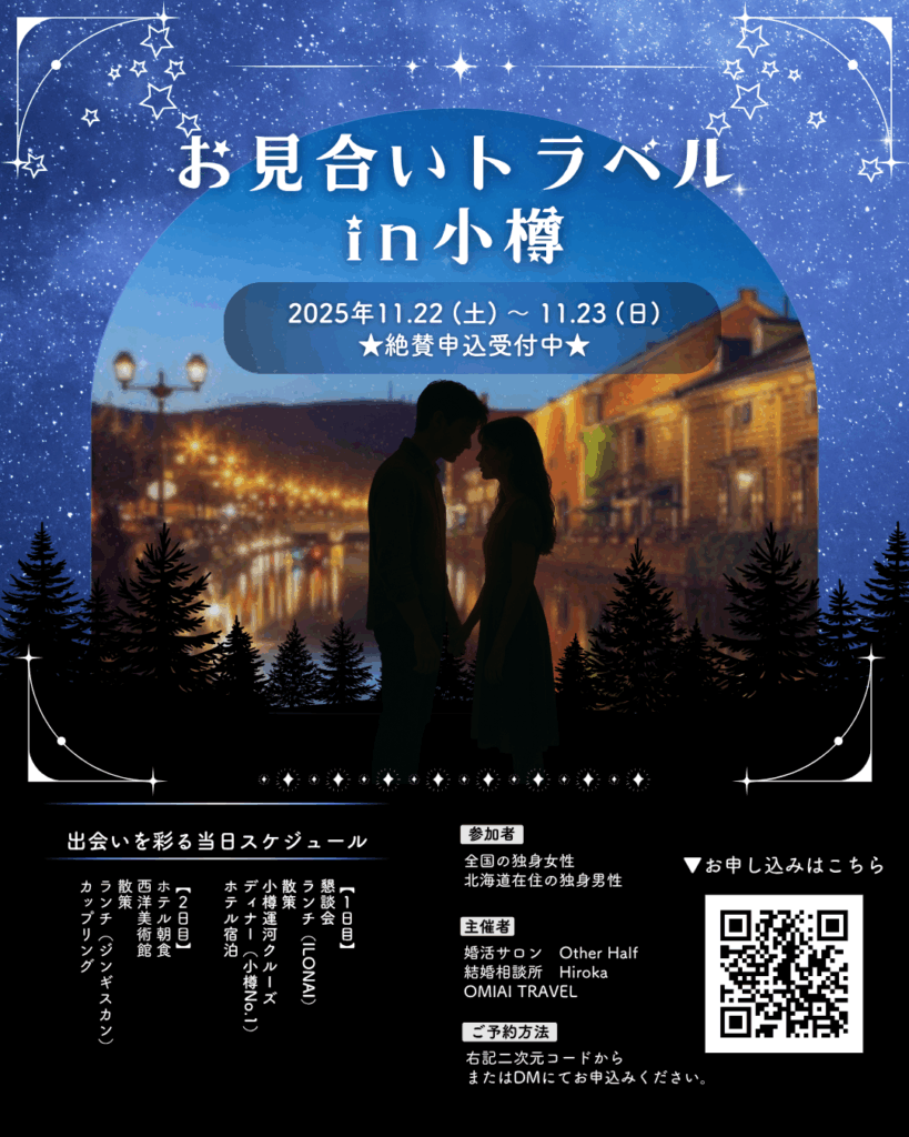 11月22日(土)〜23日(日)に開催される【北海道・小樽】婚活旅行(お見合いトラベル)では、小樽運河クルーズや地元海鮮ランチなど、小樽の魅力を満喫できる企画を予定しております。